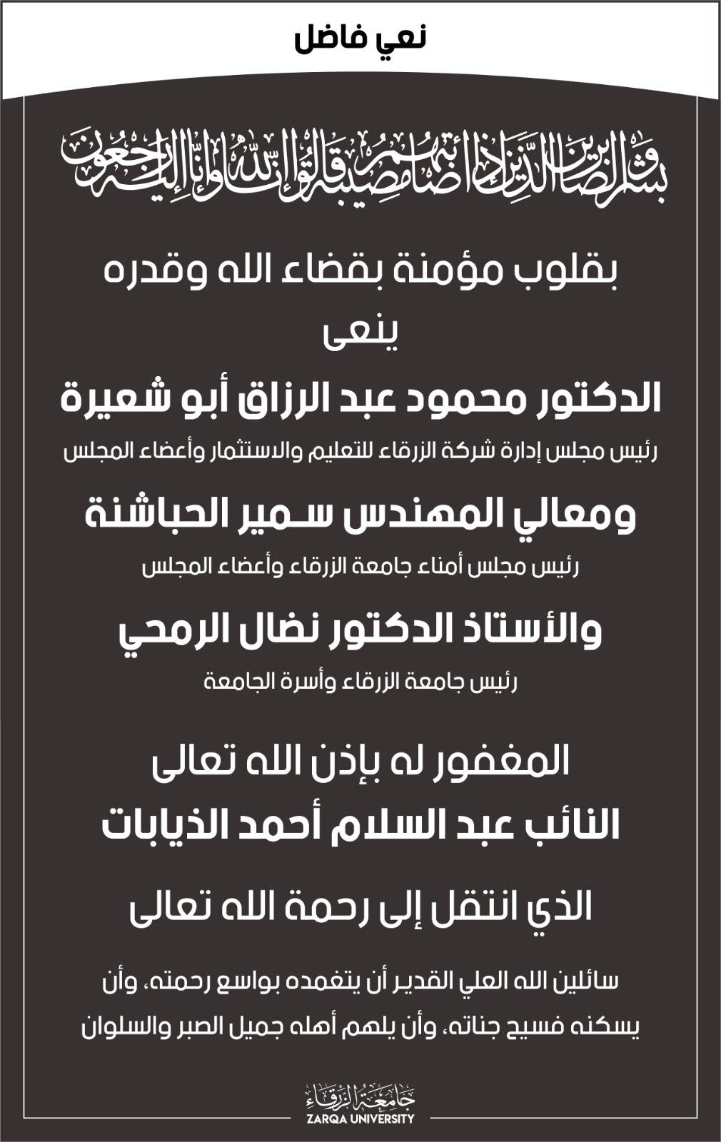 الدكتور محمود أبو شعيرة ينعى النائب عبد السلام الذيابات..