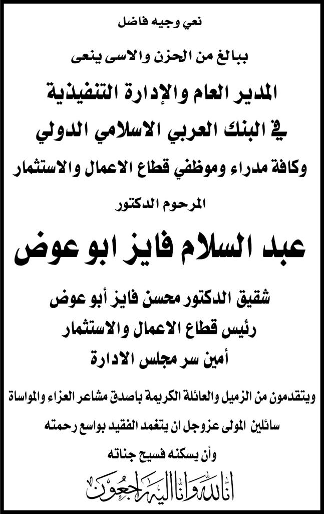 البنك العربي الاسلامي الدولي ينعى شقيق الدكتور محسن ابو عوض..